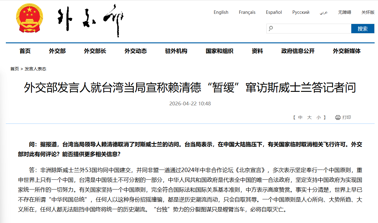 发言人表示,非洲除斯威士兰外53国均同中国建交,并同非盟一道通过2024年中非合作论坛《北京宣言》,多次表示坚定奉行一个中国原则,重申世界上只有一个中国,台湾是中国领土不可分割的一部分,中华人民共和国政府是代表全中国的唯一合法政府,坚定支持中国政府为实现国家统一所作的一切努力。有关国家坚持一个中国原则,完全符合国际法和国际关系基本准则,中方表示高度赞赏。