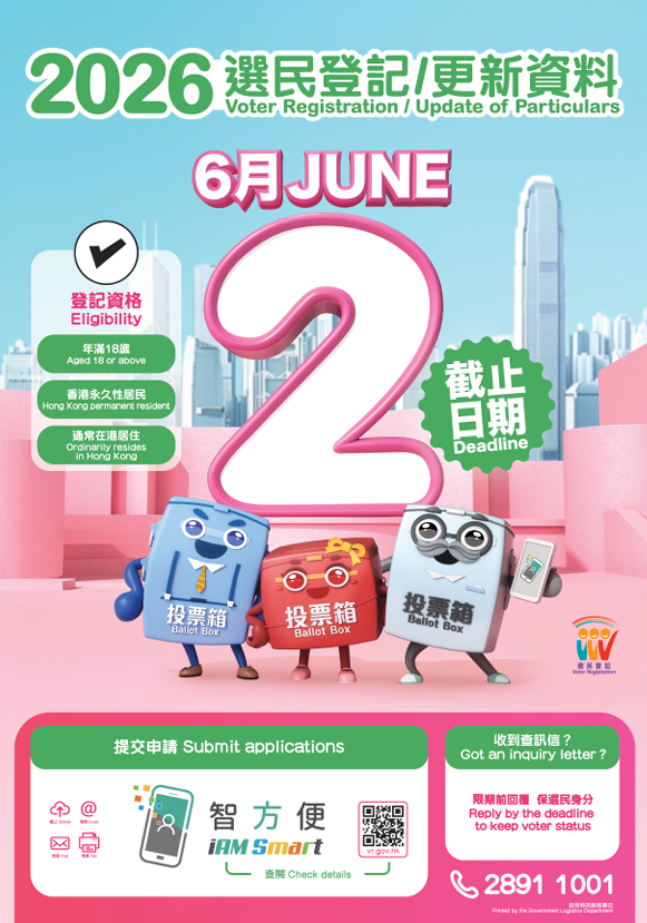 香港新闻社4月23日报道 2026年选民登记运动22日展开。选举事务处呼吁合资格的个人或团体,如尚未登记为地方选区、功能界别及/或选举委员会界别分组选民/投票人,尽早于法定限期六月二日或之前提交登记申请,其登记资料方可被纳入今年九月发表的正式选民/投票人登记册。
