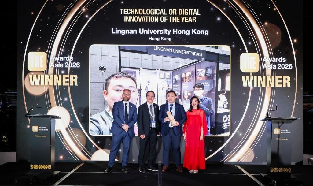 岭大数码艺术及创意产业系高级讲师简肇韬博士(右二)领导研发的“电影制作模拟教育软件CineSim”于被誉为“高等教育界奥斯卡”的“泰晤士高等教育亚洲大奖2026”中,荣获“年度科技或数位创新奖”。