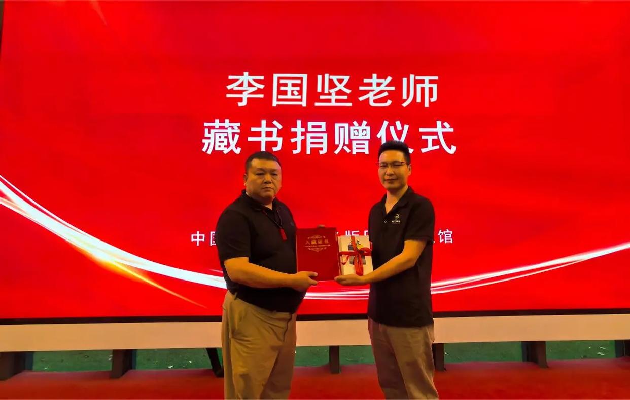 “中国当代作家签名版图书珍藏馆”馆长曹孟良(右)向李国坚颁发捐赠证书。