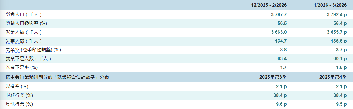 数据显示,总就业人数由2025年十二月至2026年二月的3,663,000人,下跌至2026年1月至3月的3,655,700人,减少约7,300人。同期的总劳动人口亦由3,797,700人下跌至3,792,400人,减少约5,300人。失业人数(不经季节性调整)由2025年12月至2026年2月的134,700人上升至2026年一月至三月的136,600人,增加约1,900人。同期的就业不足人数则由63,400人下跌至60,100人,减少约3,300人。
