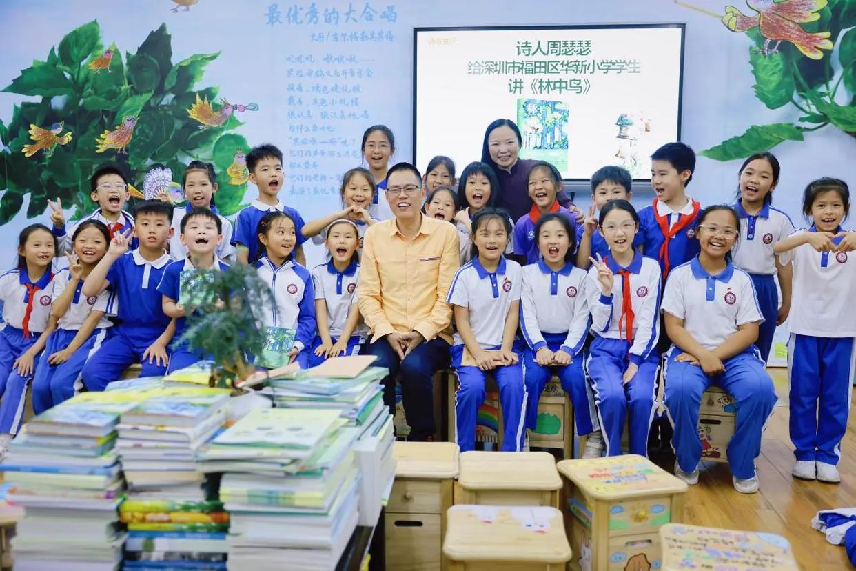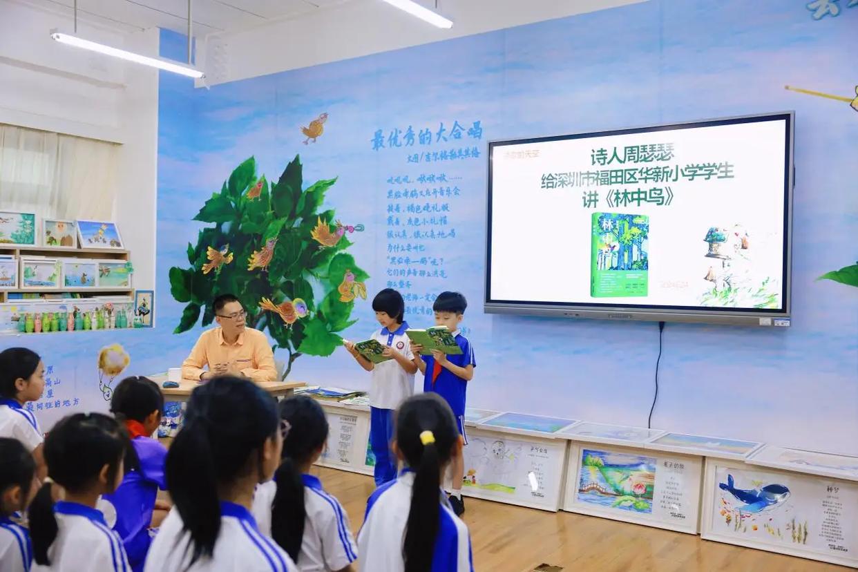 随着首个“全民阅读活动周”(4月20日至26日)在全国各地开展,著名诗人周瑟瑟来到深圳市福田区华新小学为孩子们开讲他的最新诗集《林中鸟》。活动由深圳市福田区新时代文明实践中心、福田区图书馆、福田区华新小学、北岳文艺出版社、福田区儿童图书馆香蜜分馆主办。这是福田区儿童图书馆香蜜分馆“诗人作家进校园”系列活动之一。福田区未来教育名师工作室主持人、“云水童诗”品牌课程主持人邓丽云老师主持了当天的活动。
