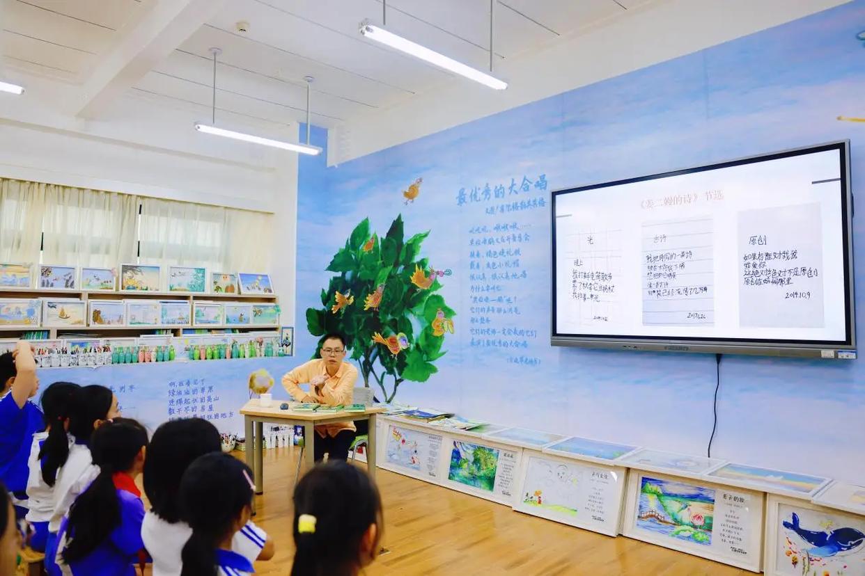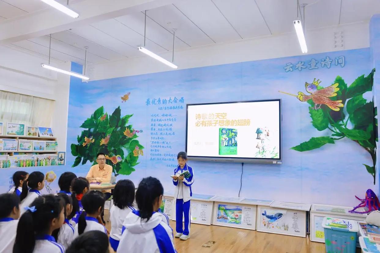 据华新小学邓曼莉副校长介绍,华新小学的诗歌教育以“守护童心、激发想象”为核心理念,通过系统化课程与实践活动,将童诗创作融入语文教学与美育体系,成效显著,出版了《云水童诗》两部,在全国产生了一定的影响。“玩童诗”品牌课程由课程部主任邓丽云主持,倡导“诵、赏、创、画、唱(跳)童诗”五位一体的学习方式,强调在“玩”中自然生成诗意。“云水童诗四感拾贝赏读法”:即“说第一感觉—品感动诗句—寻感兴诗秘—谈品读感悟”,引导学生深度理解童诗。