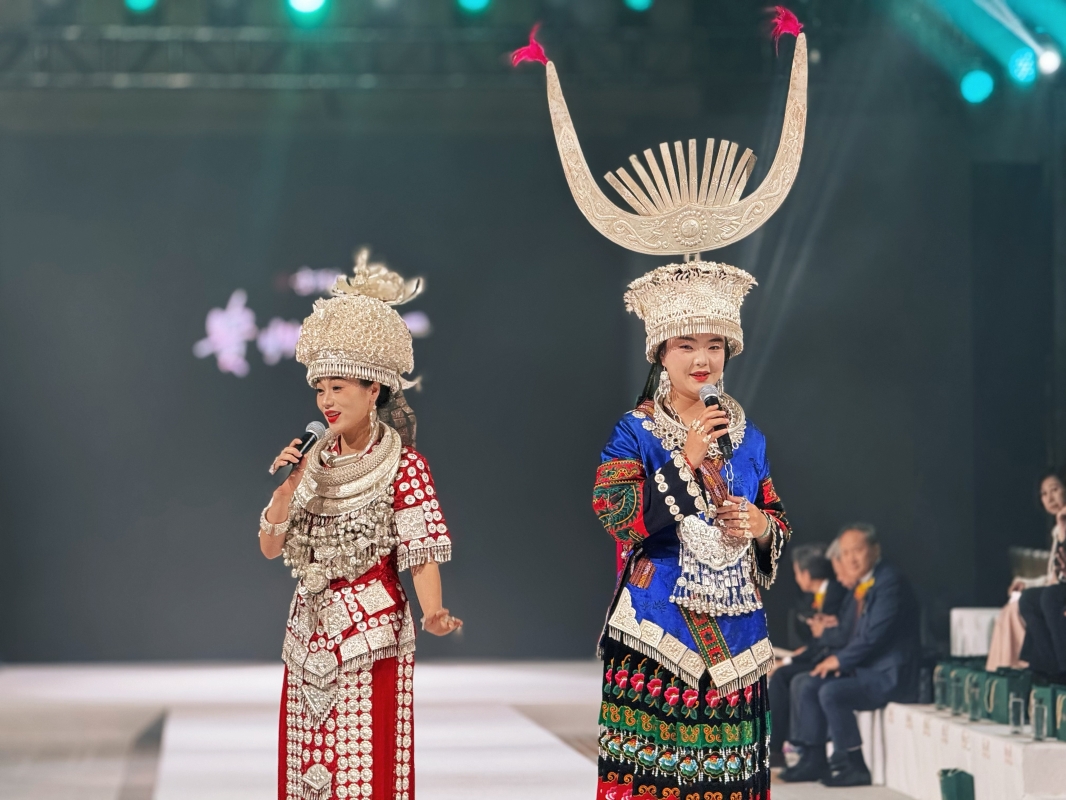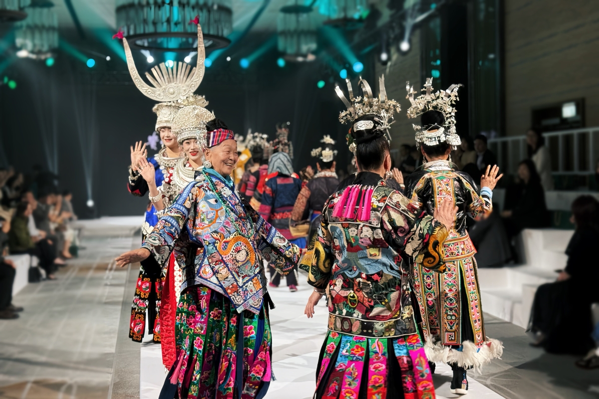 模特展示融合了苗绣、蜡染、银饰等非遗元素时尚设计服装。